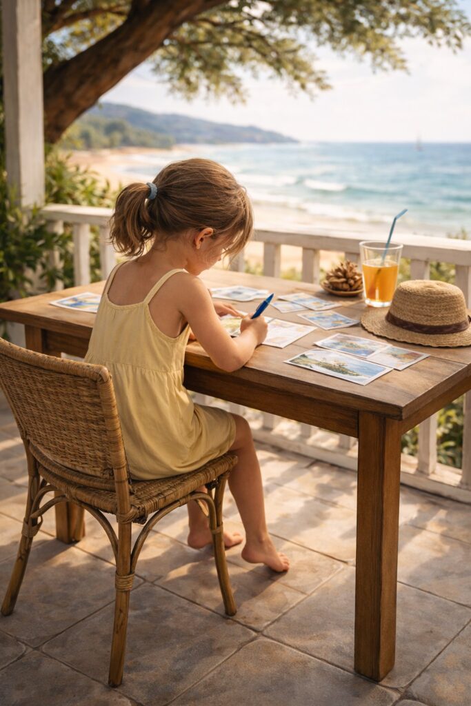 Puis Mamie réécrivait tout bien propre. Et je recopiais sur la carte postale, bêtement, avec ma plus belle écriture possible. En m’appliquant pour n’oublier aucune lettre. Sans faire de rature. Je ne savais pas toujours à qui j’écrivais.